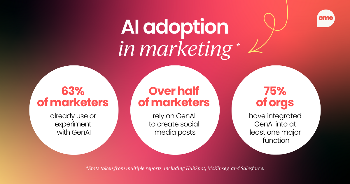 Industry research shows that marketing is becoming one of the fastest adopters of GenAI. Salesforce reports that 63% of marketers already use or experiment with GenAI, and SEO.com finds the same share using it to optimize web and social content.