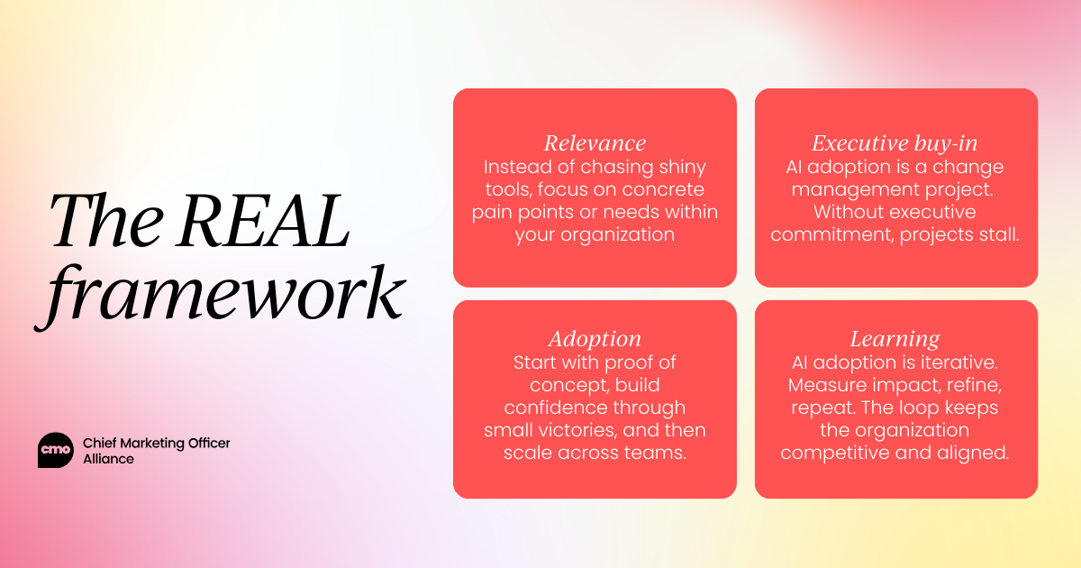 My recommendation is to approach AI adoption using the REAL framework: Relevance, Executive Buy-in, Adoption, and Learning.