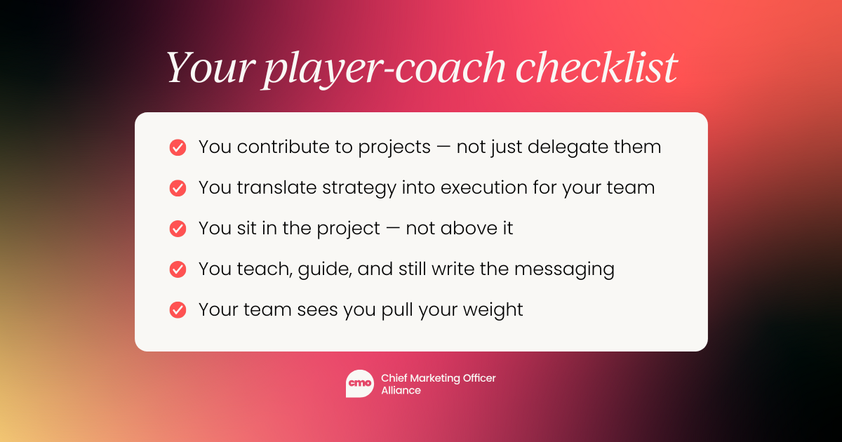 The trick is translating that strategy back to the team in a way that creates real momentum. That’s where the “player-coach” concept comes in — a term borrowed from sales, but one that applies just as well to marketing. In smaller orgs, you can’t afford a leader who just “thinks.” You need someone who joins the trenches when needed, someone who can roll up their sleeves and say, “Here’s what we’re doing, and here’s why — now let’s build it together.”