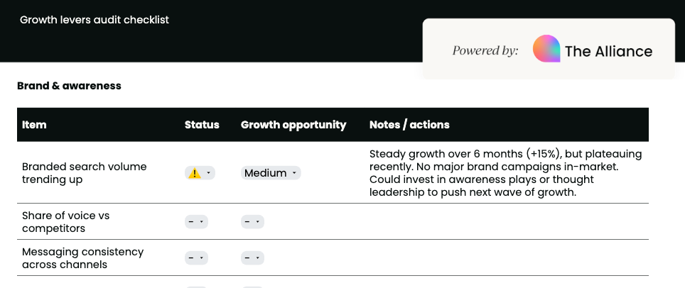 The growth levers audit checklist is a practical diagnostic tool designed for new and seasoned CMOs alike. It helps you systematically evaluate the core levers of growth (brand, demand, product marketing, lifecycle, operations, and alignment) so you can pinpoint strengths, gaps, and high-priority opportunities.