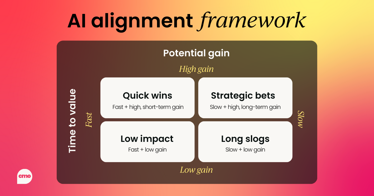 I recommend creating a visual framework plotting time versus effort against potential gains. This helps prioritize high-impact projects while also identifying quick wins that can build momentum and demonstrate value.