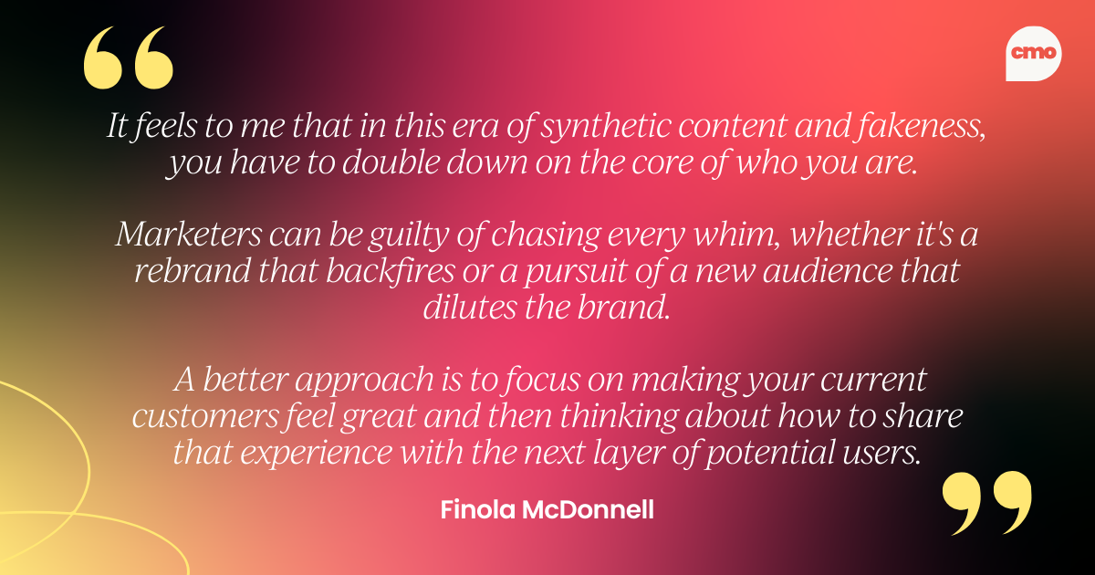 It feels to me that in this era of synthetic content and fakeness, you have to double down on the core of who you are. Marketers can be guilty of chasing every whim, whether it's a rebrand that backfires or a pursuit of a new audience that dilutes the brand.