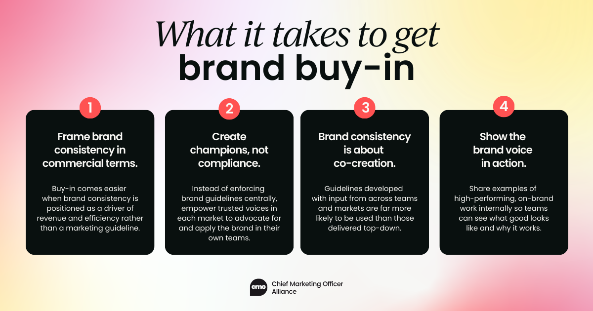 Rather than building a centralized brand police function, which creates resentment and bottlenecks, I've found more success identifying brand champions within each market. These are people who already communicate well, who care about how the company comes across, and who have credibility with their colleagues. Give them training, tools, a degree of authority, and let them be the guardians of brand standards in their corner of the organization.