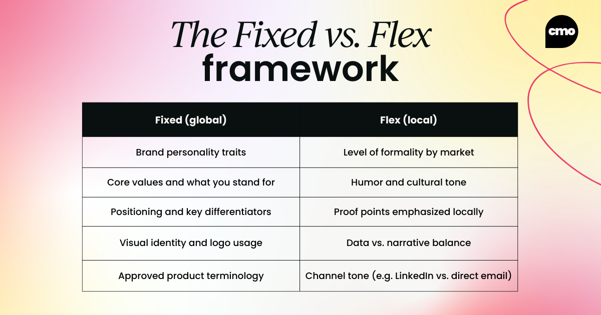 In practice, this means separating your brand voice into two layers: what must stay fixed, and what can flex.
