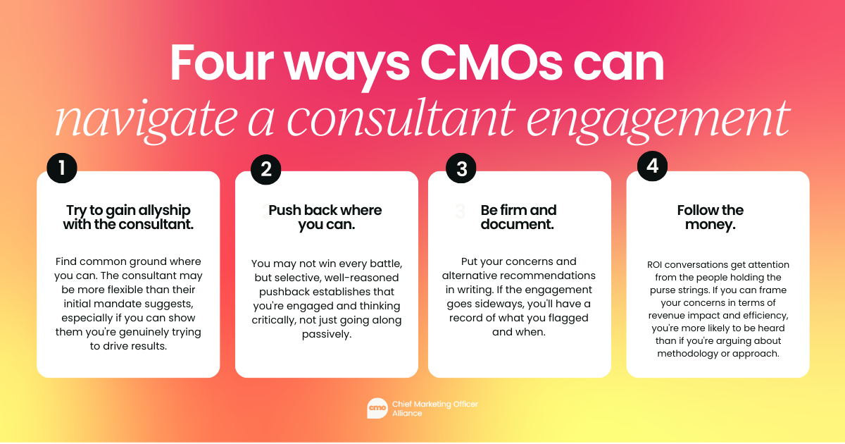 The result is a situation where the CMO disagrees with the consultant's recommendations, but leadership loves them. The CMO ends up holding the bag on running a team, strategy, and plan that they didn't help shape.