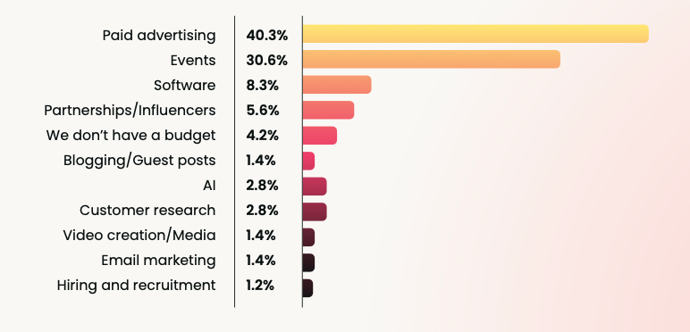 Paid advertising gets the largest budget share at 40.3%, followed by events at 30.6%. Meanwhile, over half of respondents (53.8%) expect budgets to grow, while 13.7% anticipate reductions. That creates pressure: more scrutiny over where money goes, alongside rising expectations to demonstrate impact.