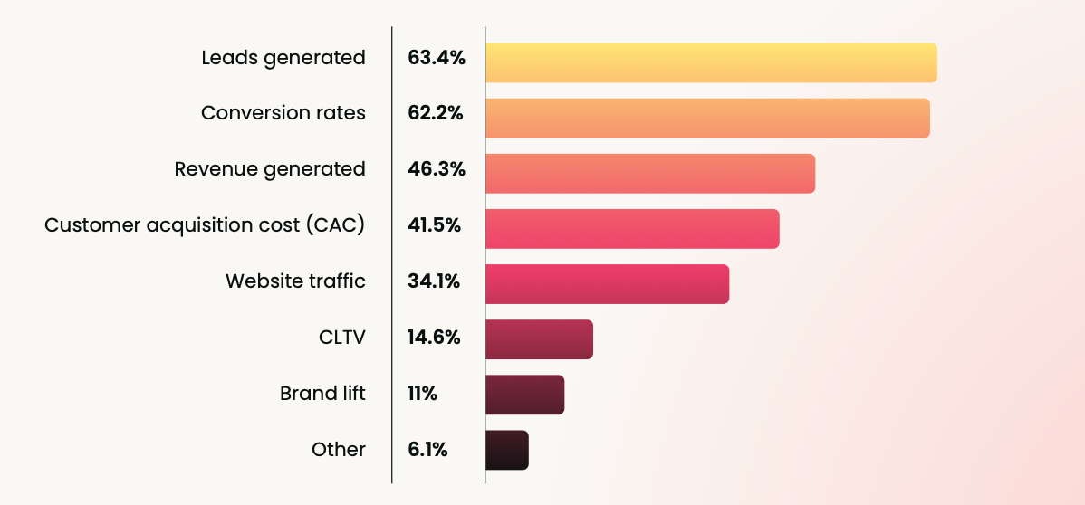 40.2% of marketers struggle with measuring ROI, making it a structural challenge tied directly to staffing constraints and burnout. The metrics teams choose (leads, conversions, revenue, CAC) reflect what's defensible and repeatable, not necessarily what captures the full picture. Brand lift sits at just 11% because it's harder to measure and communicate.