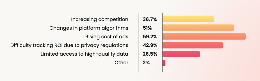 Rising costs and volatility complicate how confidently you can read these numbers. The report shows that 59.2% of marketers cite rising ad costs as their biggest challenge in performance marketing, and 51% point to changes in platform algorithms. Add in the fact that 42.9% say privacy regulations make it difficult to track ROI, and you start to see the problem.